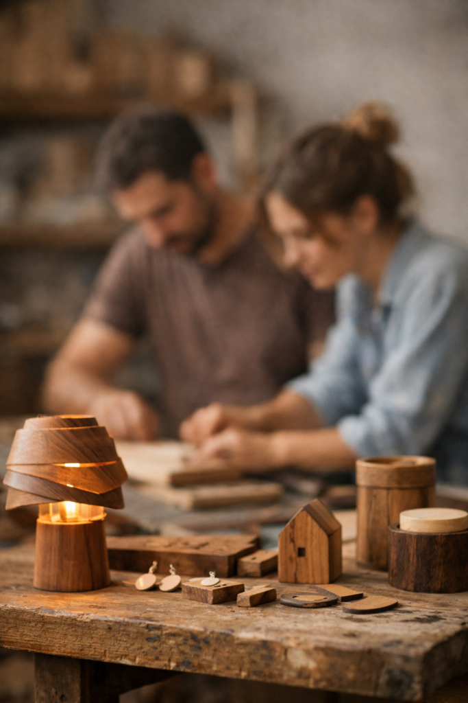 La nostra storia non inizia in un laboratorio, ma nella quotidianità: nel piacere di creare, nel desiderio di dare forma a oggetti che avessero un significato, non solo una funzione. Da lì è nata la passione per il legno, per i materiali naturali e per un artigianato contemporaneo che unisce sensibilità manuale e tecniche moderne, come il taglio laser, senza mai perdere il lato umano del fare.