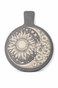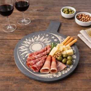 Tagliere in ardesia inciso con motivo decorativo. Ideale per servire aperitivi, formaggi e salumi, oppure come elemento d’arredo per la cucina. La finitura in ardesia dona un carattere elegante e contemporaneo; l’incisione aggiunge un dettaglio unico e raffinato.